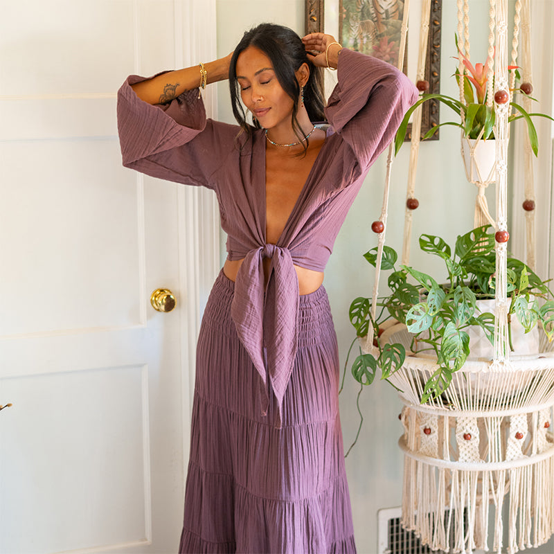Drape yourself in whimsical worldly girl vibes in this beautiful Cotton tie front Daydreamer Top! This easy-to-style, adjustable layering piece has a flowy bell sleeve that complements any look.