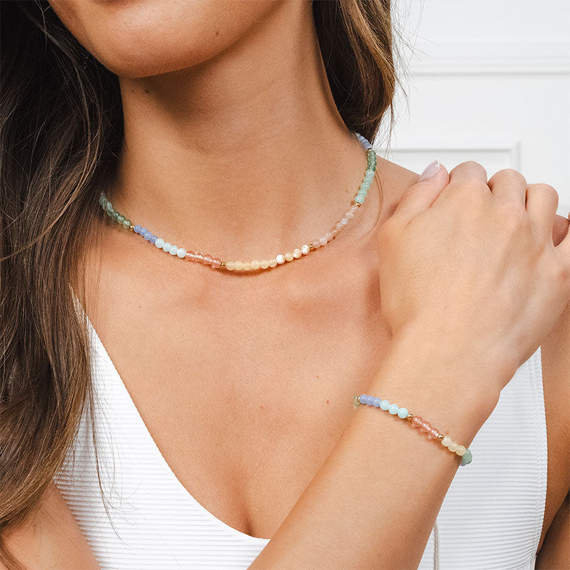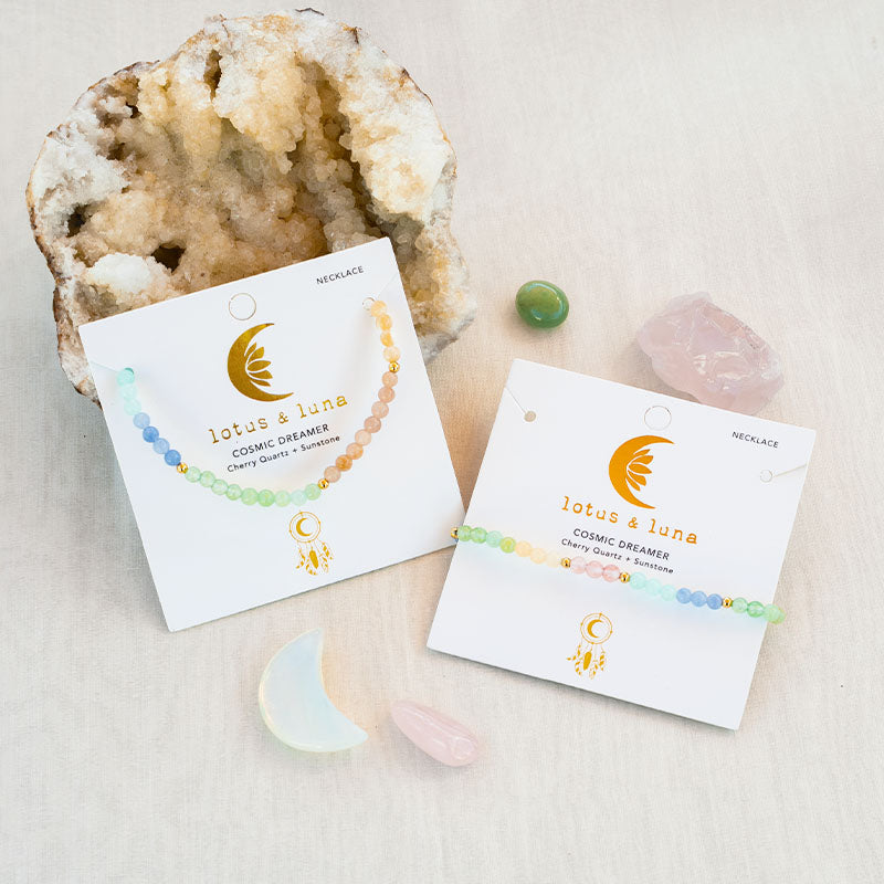 Featured Stones: Amazonite, Aventurine, Cherry Quartz, Mother of Pearl, Sunstone