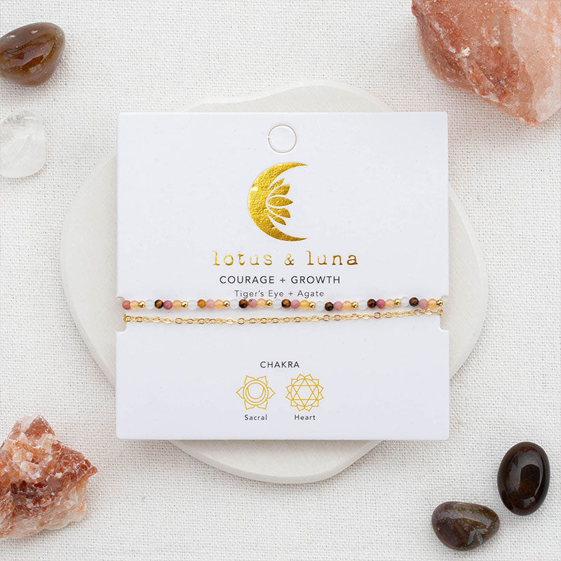 Let the Courage + Growth 2mm Layered Bracelet be your daily touchstone for inner balance and strength. This powerful blend of Tiger's Eye and Agate is more than an accessory; it's a constant companion designed to align your spirit and nurture your well-being. Each stone is hand-selected to work in harmony, helping you to clear your mind of self-doubt and bring an enveloping sense of serenity and purpose.