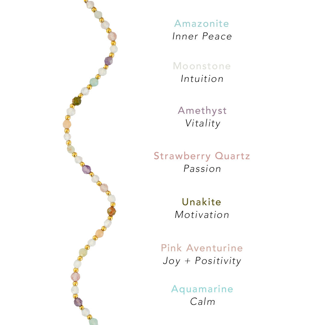 Featured Stones: Amazonite, Moonstone, Amethyst, Strawberry Quartz, Unakite, Pink Aventurine, Aquamarine