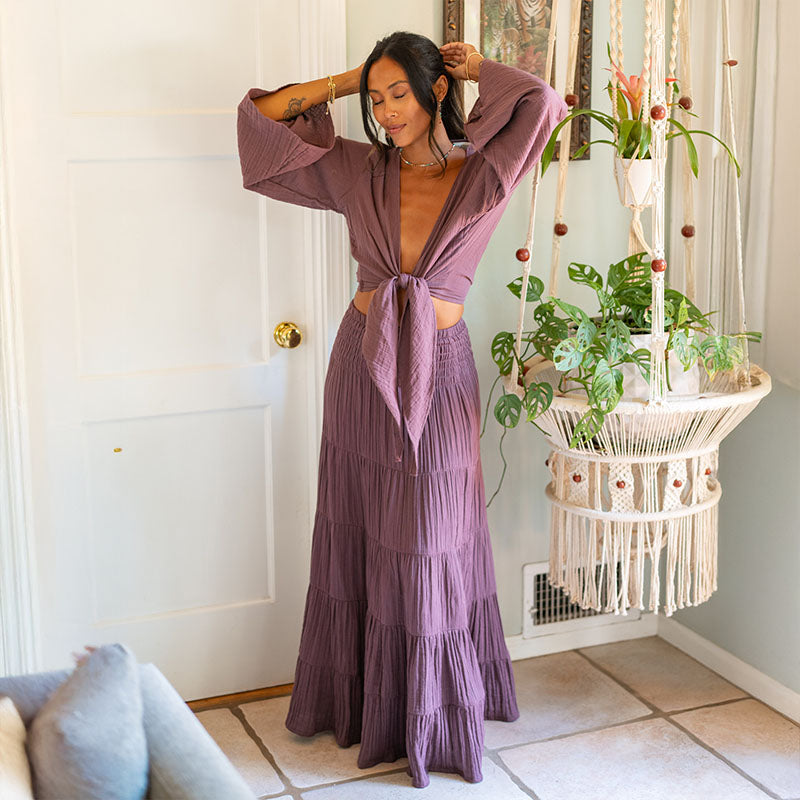 Discover the perfect blend of comfort and bohemian charm with the Lotus & Luna's Cotton Smock Waist Maxi Skirt. Crafted from lightweight and breathable 100% cotton, this skirt flows beautifully, offering a relaxed and airy feel. The smocked waistband provides a comfortable and flexible fit, accentuating your natural waistline. Ideal for warm weather adventures or simply lounging in style, this is a versatile piece you can wear year after year.