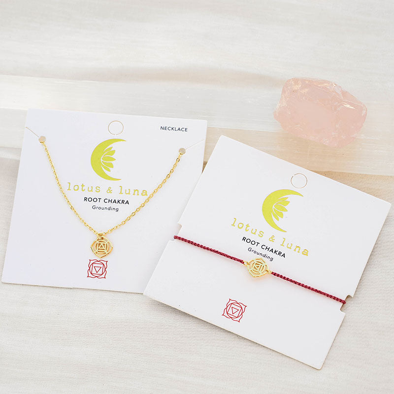Materials: Root Chakra Gold Plated Brass Charm, Gold Beads and Nylon Pull Through Cord or Sterling Silver Plated Brass Charm, Silver Beads and Nylon Pull Through Cord